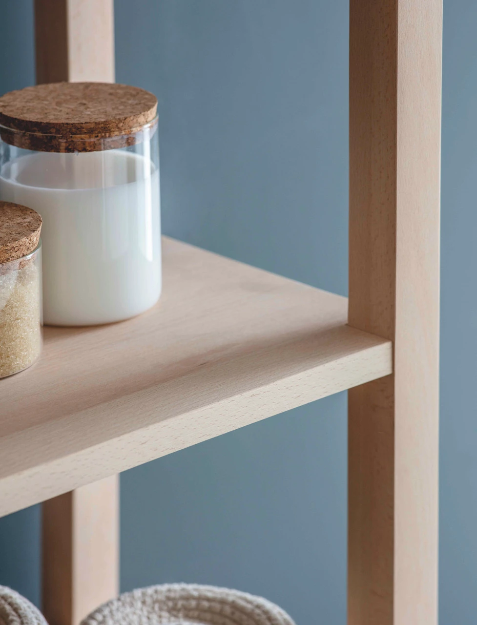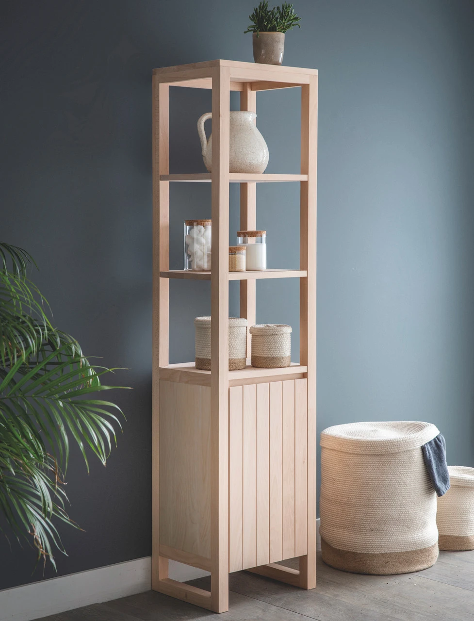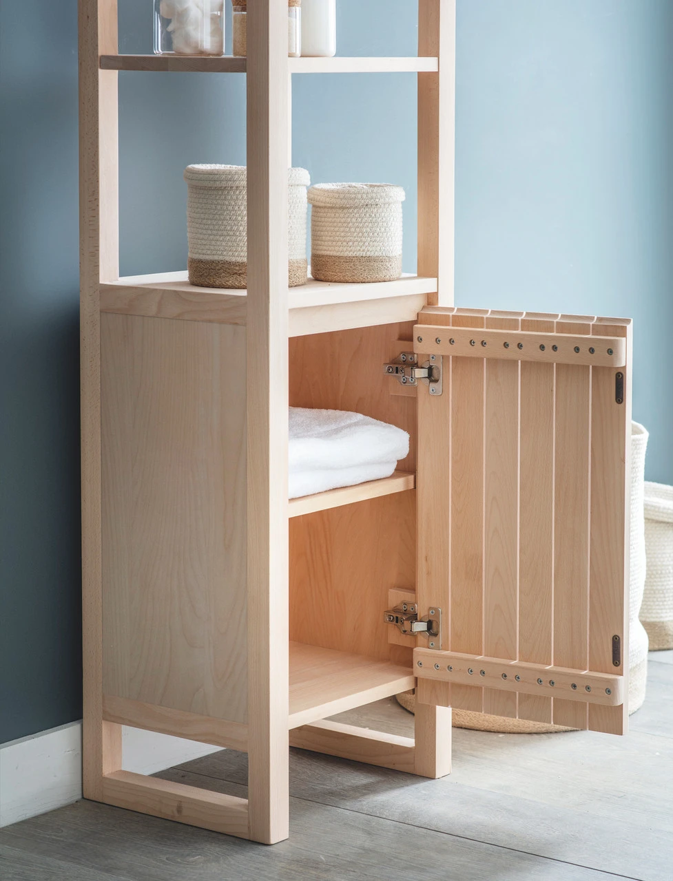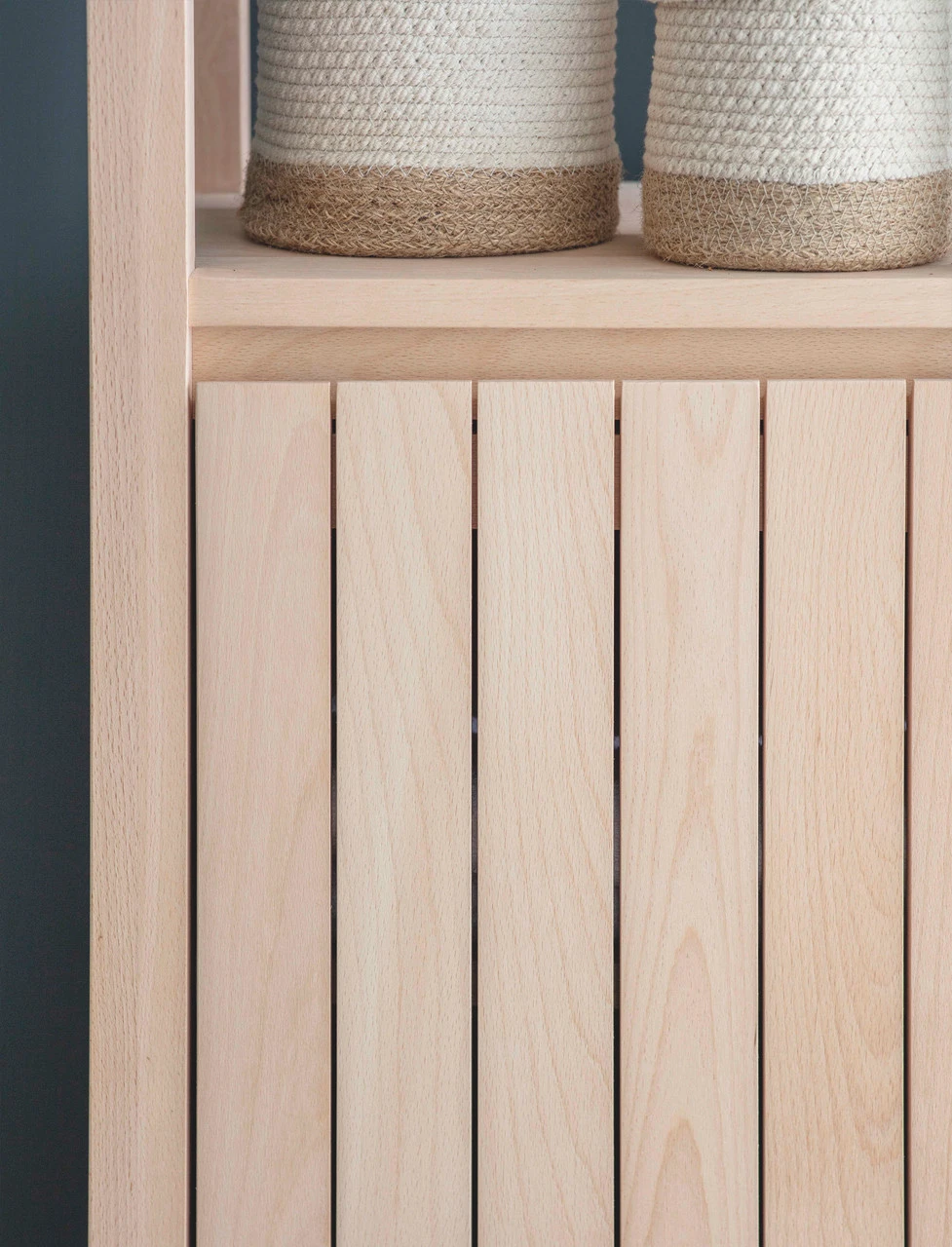 Frame and door are solid Beech, side and shelves are Beech Veneer